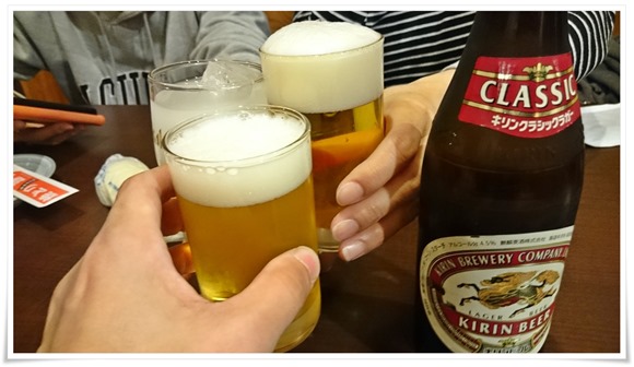 まずは瓶ビールで乾杯!(チビ二号はもちろんカルピスです)