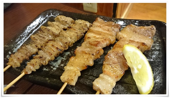 また逆三角形の筋肉モリモリの体みたいに串刺しされた鳥皮と豚バラ見た目から楽しめますよね。塩で焼き上げてあり旨々でした。