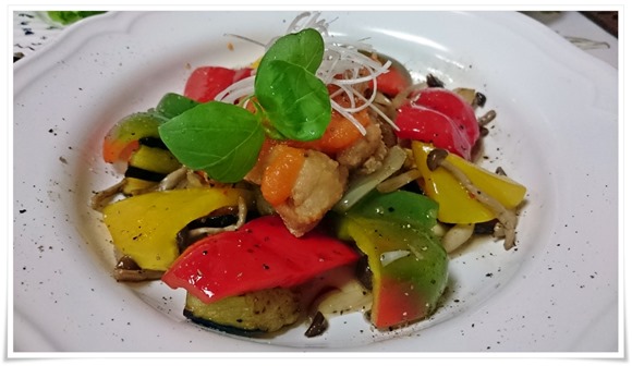 続いて「チキンと温野菜のサラダ」になります。色鮮やかで、見た目から楽しませてくれる一品でした。こうして食べるとパプリカもツマミになるもんですね(笑)