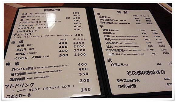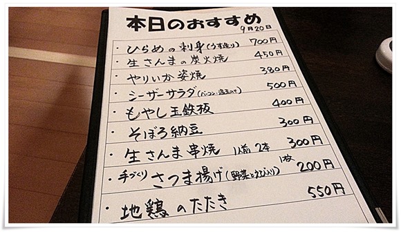 前回もそうでしたが、「本日のおススメ」に、お刺身などの魚介類のメニューが用意されているみたいですね!生さんまの炭火焼にかなり惹かれましたが・・・。