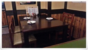 店内入ると右手にカウンター席が8席程度。左手にテーブル席が3卓(4人掛けx2卓 / 3人掛けx1卓)完備されています。また店内奥側には20名ちょっとの宴会も可能なテーブル席が6卓程完備されています。