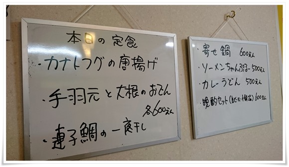 入口には黄色の提灯に「定食屋」の文字。もしや夜の部も定食メニューのみで、お酒は飲めないのかと脳裏に浮かびましたが、店頭に掲げられたホワイトボードに「晩酌セット」の文字を見つけて突入しちゃいました。