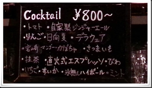 唯一素材にこだわったカクテル(マスターおススメの素材一覧)が店内中央のボードに掲示されています。(Cocktail \800~)マスターが仕入れに行って厳選したフルーツを紹介しているとの事です。