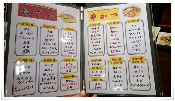 こちらが店頭に掲示されているメニューになります。メインはおでんと串かつですね。お店に入る前にある程度のお値段を知れるのは初めての訪ねるお店の場合では貴重ですよね。盛り合わせも用意されておりサクッと飲める感じです。