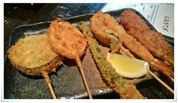 まずは「串揚げ盛り(6本)」からスタート。名物の「とんふらい」を含む、ヘルシーな盛り合わせとなっています。(この盛り合わせだけで十分飲めちゃうかも)