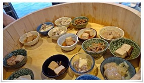 まずはお通しが登場。桶に入れられた大量の小鉢の中から好きなものを選択可能でした。事前に店舗入口付近に用意されているお惣菜コーナーで確認しておけば、スムーズに選択できるかと思われます。(ここから小鉢に移されていました)